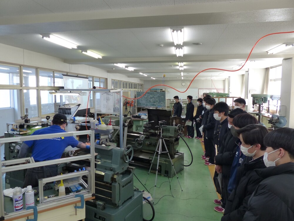 山梨県立韮崎工業高等学校 > 教育活動 > 企業連携授業【技能五輪出場者による旋盤作業見学】 2023年2月16日カテゴリー: 教育活動 企業連携授業【技能五輪出場者による旋盤作業見学】 2月15日(水)の2・3校時に、電子機械科・システム工学科の企業連携授業として、 横河マニュファクチャリング株式会社様にお越しいただき、技能五輪全国大会出場選手の旋盤作業見学を行いました。今回は、1年生の電子機械科・システム工学科の生徒がこの作業を見学しました。 旋盤作業は2022年全国大会へ県代表選手として出場された令和元年度卒業生:若杉康さんが行いました。目にも留まらぬ速さで作業され、見学した生徒からは、「動作のスピードに驚いた」「迫力があった」「これから自分が頑張るモチベーションになった」などの感想が出ました。 今回の授業から、資格取得や努力すること、将来を考えることの大切さを感じてもらい、今後に生かしてほしいです。