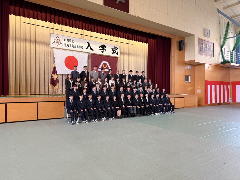 山梨県立韮崎工業高等学校 > 学校から > 令和8年度入学式 2026年4月9日カテゴリー: 学校から 令和8年度入学式 本日、令和8年度入学式が執り行われました。130名の新入生が、今年リニューアルした制服を身にまとい元気に入学してくれました。慣れないネクタイを付けて緊張している様子は、どこかワクワクしているようにも見えました。今後の活躍に期待!